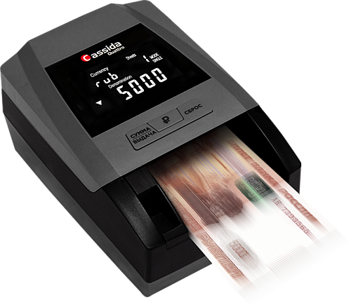 Компактный и надежный детектор Cassida Quattro работает с российскими рублями. Имеет достаточно высокую скорость банкноты и проводит детекцию в режимах: SD: контроль размера банкнот, UV: контроль в УФ диапазоне, MG: магнитная детекция, IR: контроль ИК защиты, DD: контроль оптической плотности, SP: спектральный анализ краски. Работает от сети или аккумулятора, который является опциональным решением. Есть режимы суммирования и пересчета. Для связи с ПК используется USB.